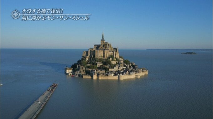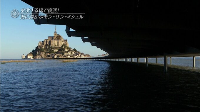 潮の満ち引きと関わりの深い世界遺産は他にもあります。代表的なのが、フランスの世界遺産「モン・サン・ミシェルとその湾」。海に浮かぶ修道院として、もっとも人気のある世界遺産のひとつです。かつては潮が引くと歩いて渡れるようになり、巡礼者はそのタイミングで修道院と行き来していました。19世紀に堤防のような橋が作られ、いつでもモン・サン・ミシェルに行くことが出来るようになったのですが、これによって潮の流れが変わり、泥が堆積して修道院周辺が徐々に埋め立てられる事態になりました。放っておくと「海に浮かぶ修道院」ではなくなり、ただの陸地に建つ修道院になってしまう・・・そこで2014年に潮の流れを妨げない新たな橋が作られました。番組で撮影したのですが、橋脚で支えられた橋の下を潮が流れるように改良。さらに春と秋の大潮のときには、橋の一部が海面下に沈むように意図的に設計されました。これによって1年のうち20日間ほど、モン・サン・ミシェルは完全に陸と断絶し、「海に浮かぶ修道院」という本来の姿を見せるようになったのです。