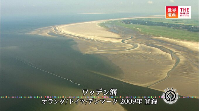 もうひとつ、潮の満ち引きが生み出す壮大な景観を誇るのが世界遺産「ワッデン海」。オランダ、ドイツ、デンマークの三カ国の沿岸、実に650キロもつづく世界最大の干潟です。全体の三分の二が潮が引いたときに陸地となり、場所によっては10キロ先の海の上まで歩いて行くことが出来るようになります。満ち引きは約6時間ごとに起き、水位の差は大きなところで4メートルもあって、砂と水が作る風景は時間と共に変化していきます。