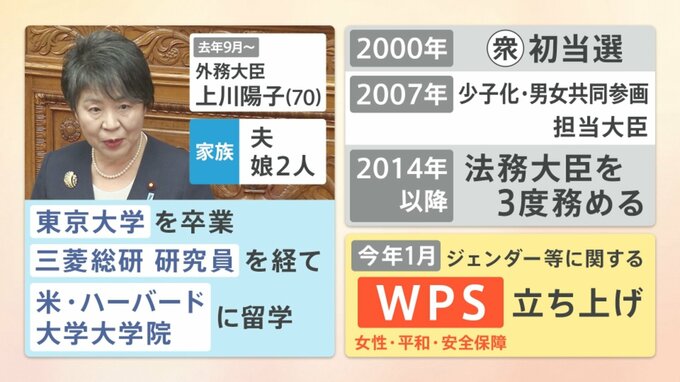 上川氏は東京大学卒業後、三菱総研からハーバード大学大学院に留学した。2000年に衆議院静岡1区で初当選。落選した時期もあったが現在までに当選7回、法務大臣を3回務めている。