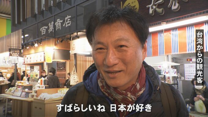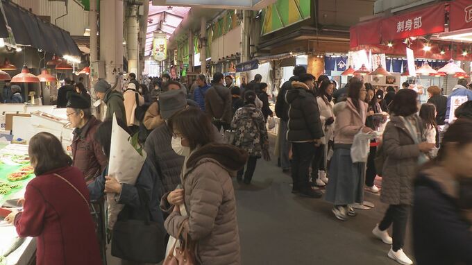金沢市の近江町市場。3連休初日の10日は、中国や台湾の旧正月「春節」とも重なり、多くの買い物客で活気づいていました。