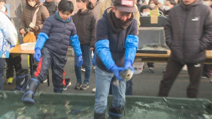 フグのつかみ取り体験では、子どもたちがプールに入ってトラフグを追いかけました。