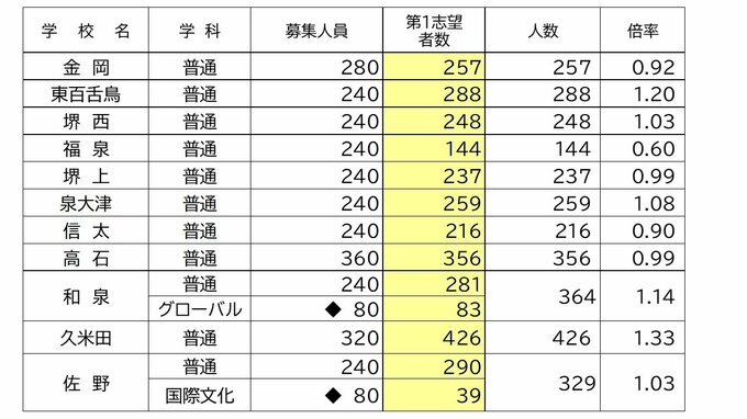 【2月最新】大阪府公立高校入試2024 北野1.48倍、茨木1.96倍、天王寺1.2倍 公立高校希望者は59%で6割切る【令和6年度高校受験 進路希望調査】 毎日放送 2024年2月14日(水) 12:49 国内 学校別の倍率 旧第4学区 日根野1.16倍 金岡0.92倍