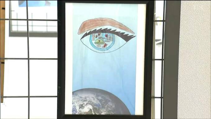 こちらはウクライナ東部の子どもたちが描いた戦地の絵です。戦車や爆撃を受けた町の様子が瞳に映し出されています。