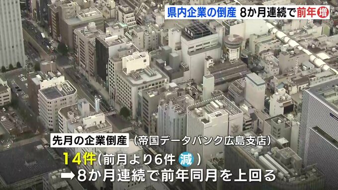 先月の広島県内企業の倒産件数が、8か月連続で前年の同じ月を上回ったことが民間の調査会社のまとめでわかりました。帝国データバンク広島支店によりますと、先月、倒産した企業の件数は14件でした。前の月より6件…