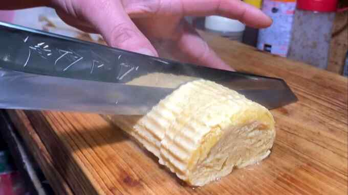 矢野さん、卵は福岡県産を使っています。さらに、「だし巻き玉子」を切り分ける包丁を特別にオーダーするこだわりよう。刃の厚みを薄くすることで、切った際に断面からだしが出にくくなるように。だしをたっぷり含んだ味わいと、美しい断面という「見た目の美しさ」を両立させています。また、包丁の使用頻度が多いため、軽めの仕様にしました。疲れないようにして、たくさんのお客さん最高のだし巻き卵が提供できるように。しかし、数あるメニューの中で、なぜ「だし巻き玉子」にこだわるのでしょうか?