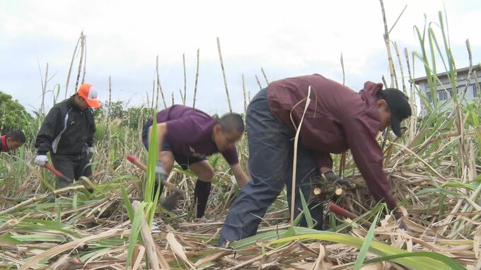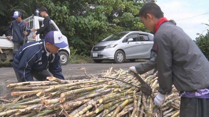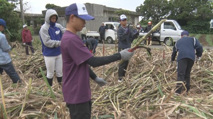 宮古島市のサトウキビ畑で収穫に汗を流したのは、宮古高校野球部の1・2年生17人です。