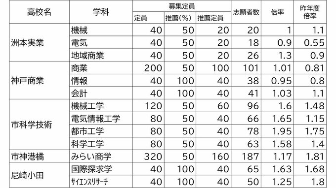 兵庫県公立高校入試2024 市尼崎双星2.55倍 市西宮2.5倍 神戸2.45倍【推薦入学と特色選抜、志願倍率の確定値】 毎日放送 2024年2月13日(火) 06:00 国内 学校別の倍率一覧 新設の御影(文理探究)は2.38倍 神戸(総合理学)2.45倍