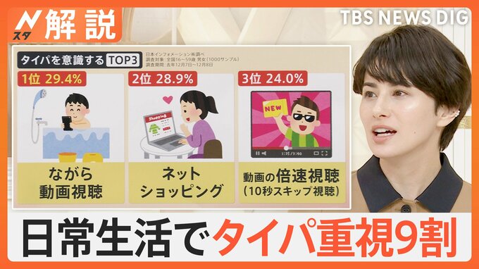 時間を効率的に使う「タイパ」。重視する人はおよそ9割にものぼるといいます。現代人が求める"満足度の高い"時間の使い方をご紹介します。良原安美キャスター:タイパはタイムパフォーマンスの略。費やした時間に…