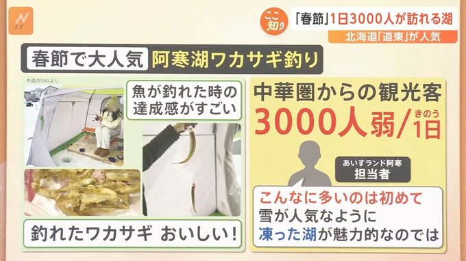 春節で観光客は、11日の1日だけで3000人弱が中華圏から来たということで、あいすランド阿寒の担当者は「こんなに多いのは初めて。雪が人気なように、凍った湖が魅力的なのでは」と話しています。具体的になぜなのかわからないんですけども、とにかく大人気ということでした。コロナ前と比べても、たくさん来ているそうです。