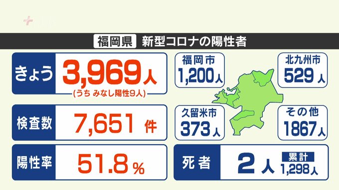 福岡県は19日、新型コロナウイルスの検査で新たに3969人が陽性だったと発表しました。発表自治体別の内訳は、福岡市が1200人、北九州市が529人、久留米市が373人、そのほかの地域が1867人…