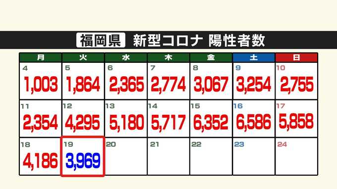 福岡県の一日ごとの新規陽性者数を示すカレンダーです。連日、多くの陽性者が確認され、収束が見通せない状況が続いています。