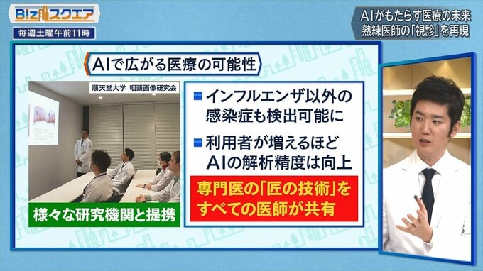 一生医師を続けても、ずっと自分の人生で見られる患者さんや喉の数は、おそらく数千人から1万人程度だと思うが、AIは元となってるデータベースが50万枚の画像から見られる。このデータベースはインフルエンザのデータが多いが、それ以外の病気の方もいる。例えば喉にサインが出る病気なら、咽頭がんもある。それからコロナみたいな感染症やいろんなアレルギーの病気もあるので、データが増えていくほど、将来的にはいろんなAIの開発に繋がっていく。普及させてどんどん画像が蓄積されていくことで、より精度も上がっていくし、他の病気にも使えるということになってくる。そして承認を取って世の中に出していき、元々のデータは患者さんのものなので、患者さんに還元できるサイクルに繋げていきたい。