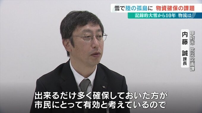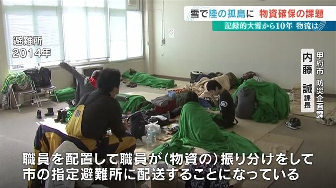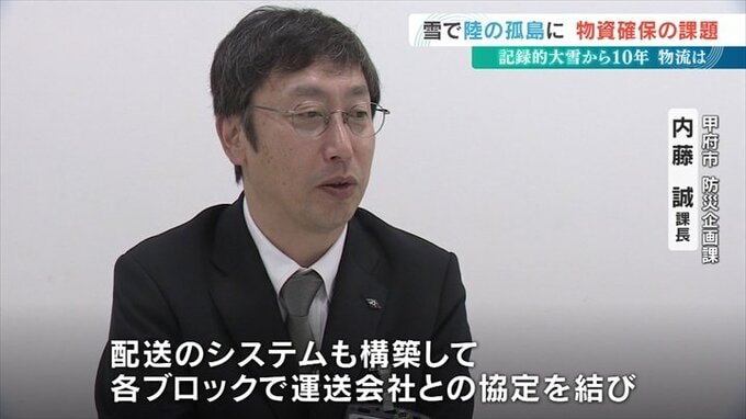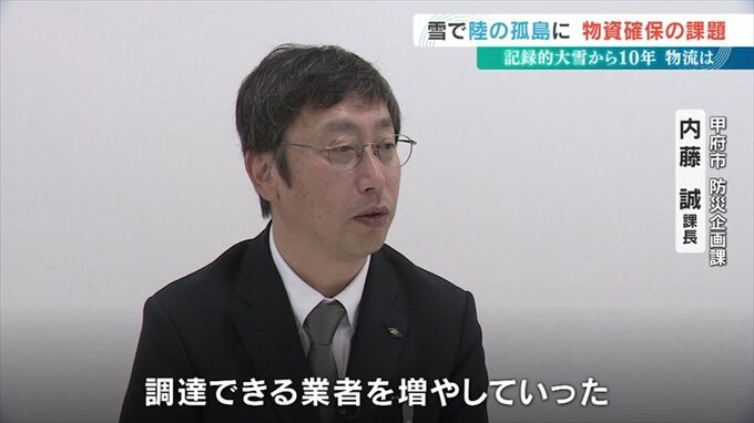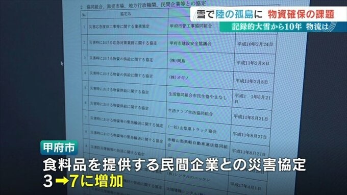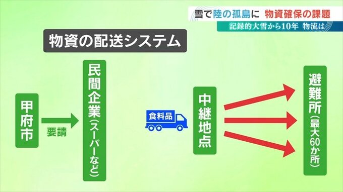 甲府市は食料品を提供する民間企業との災害協定を大雪以前の3から7に増やしました。そして甲府市の要請で民間企業が食料などを中継地点へ運び、そこから運送会社が最大60の避難所へ配送するシステムも整備しています。