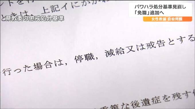 この問題は2020年10月、県立高校の30代の女性教諭が同僚の男性教諭からのパワハラが原因で自殺したもので、現在59歳の男性教諭は今月2日付けで停職3か月の懲戒処分を受けました。県教委の基準では現在、セクハラに関しては「免職」の規定が設けられている一方、パワハラについては、「免職」の規定がなく「停職、減給又は戒告」となっています。こうした中、佐藤教育長は今年度中に懲戒処分の基準を見直すことを明らかにしました。パワハラに関しても「免職」の規定を設ける方針です。