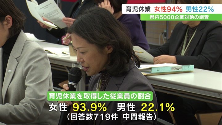 それによりますと企業向けの調査では719件の回答があり、2021年10月から3年間に子どもが生まれて育児休業を取得した従業員の割合は女性が93.9%男性は22.1%でした。