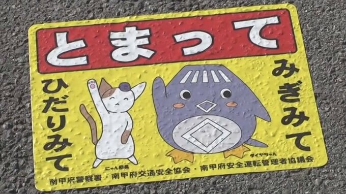 通学路での事故を防ぐため、子どもたちや、車のドライバーに注意を呼び掛ける「ストップマーク」を警察などが甲府市の小学校に贈りました。「ストップマーク」は「とまって」と書かれた道路に貼るシールで、横断歩…