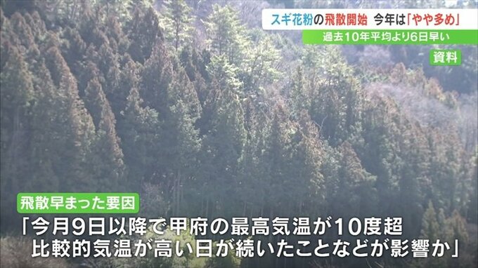 飛散が早まった要因として研究所は「2月9日以降で甲府の最高気温が10度を超え、比較的気温が高い日が続いたことなどが影響した可能性がある」としています。