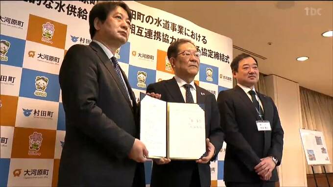宮城県の大河原町と村田町は13日、地震などの災害時にどちか片方の上下水道が使えなくなった場合に、2つの町の間にある緊急用の水道管を使い水を融通しあうことなどを定める協定を県内で初めて結びました。県など…