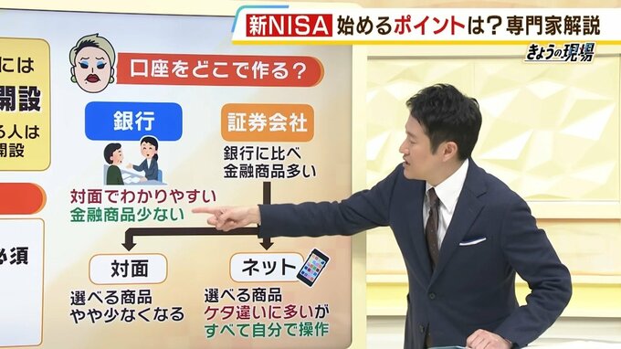 ――口座は、どこで作ったらいいんですか、例えば銀行です。対面でわかりやすいけど、投資する先の選択肢が少ないという点もある。一方、証券会社は銀行に比べると金融商品は多いです。