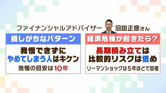 ――「Q 経済危機が起きたらどうしたらいいですか」という質問について沼田さんは、「積み立ては比較的リスクは低め。リーマンショックは5年ほどで回復」と回答しています。
