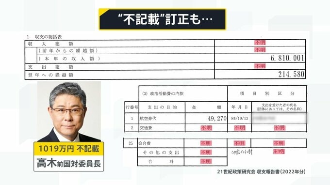 例えば安倍派幹部の高木前国対委員長が代表を務める政治団体の収支報告書(2022年分)には、一部に金額が書いてありますが、収入・支出の欄に「不明」、使途についても「不明」がいっぱい並んでいます。