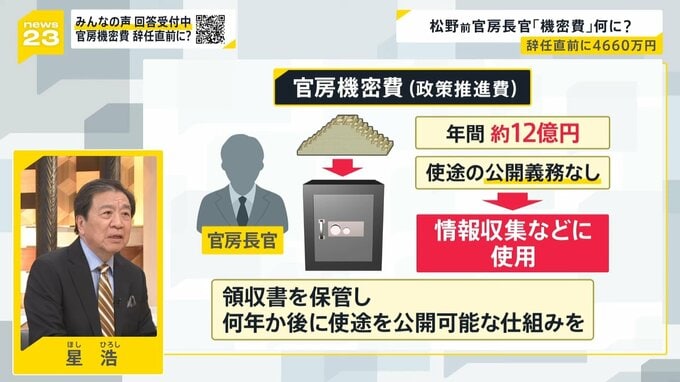 予算額は年間でだいたい12億円、1か月に1億円ほどが2回か3回に分けて官房長官に支出されるものです。外交上の情報収集に使われることが多いといわれていますが、裏金問題で政治家に対する信頼が地に落ちていますので、「一体何に使われているんだ」という疑念が生じるのは当然です。松野さんが私的に使ったとは思えませんが、やはり国民の税金ですから、少なくとも何年か経った後には「こういうものに使った」と公表・公開する仕組みを導入する必要が出てきたのかなと思います。