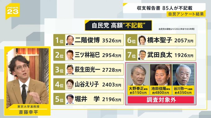 おととしまでの5年間で不記載額が多かった議員は、1位が二階元幹事長の3526万円をはじめ、2000万円規模、1000万円規模と続いています。ただ、この中には高額の不記載で起訴された大野泰正被告や池田佳隆被告、谷川弥一元議員は含まれていません。すでに党を除名されていることから調査が及ばないということです。