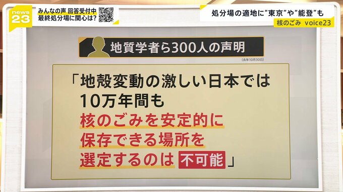 こうした状況もあって、地質学者ら300人は、2023年10月、声明で、「地殻変動の激しい日本では、10万年間も、核のごみを、安定的に保存できる場所を選定するのは、不可能である」という見解を示しています。