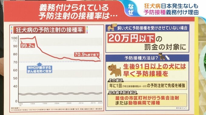 狂犬病の予防注射の接種率を見ると、1969年には接種率が99.2%でしたが徐々に低下し、2022年には70.9%まで下がっています。
