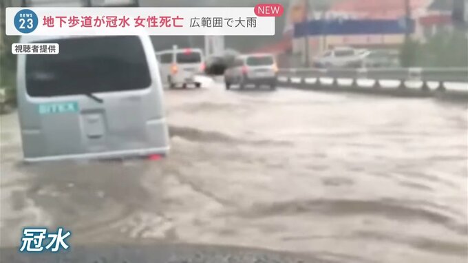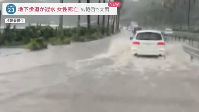 愛知県・豊川市では、前を走る軽自動車のナンバープレートやテールランプが隠れてしまうほど道路が冠水しました。