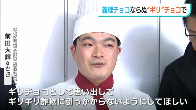 【にいがた製菓・調理専門学校 えぷろん 前田大輝さん(20)】「特殊詐欺は怖いのでチョコレートを食べた時に義理チョコとして思い出してギリギリ詐欺に引っかからないようにして欲しいと思います」