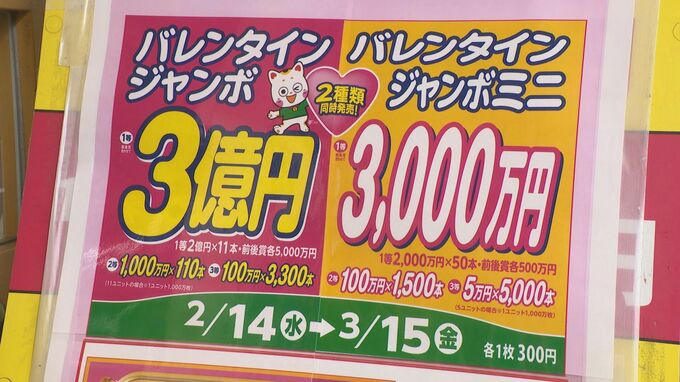 バレンタインジャンボは1等前後賞合わせて3億円が当たる宝くじで、今年は高額当選のチャンスを手にしてほしいと、2等の1000万円の当選本数が去年のおよそ3倍に増えています。
