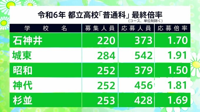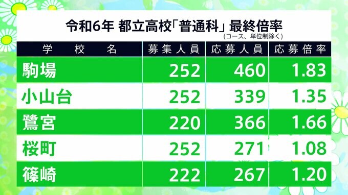 都立高校入試2024 最終志願倍率は日比谷1.81倍、西1.70倍、国立1.56倍に【令和6年度高校受験 進路希望調査】 TBSテレビ 2024年2月14日(水) 19:02 国内 学校別の一覧 駒場1.83倍、小山台1.35倍