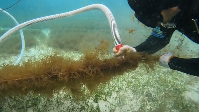 午前7時、港を出た生産者は漁場に着くと海に潜り、ポンプにつながれたホースで成長したモズクを養殖網から吸い取って収穫していきます。