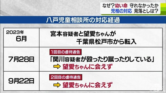 2023年7月と9月の2回、虐待通告を受けた児童相談所が家庭訪問を行ったほか、面接を求めるなどしましたが、いずれも望愛ちゃん本人と合うことができませんでした。
