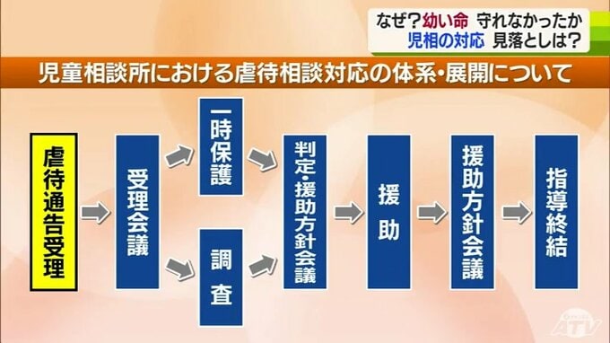 虐待通告を受けた児童相談所は対応として一時保護のほか、家庭訪問や面接などの状況をもとに複数回の会議を通して子どもや保護者の援助を進めます。ただ、今回、児童相談所が指導を終えるまでに面接できたのは1度だけ。
