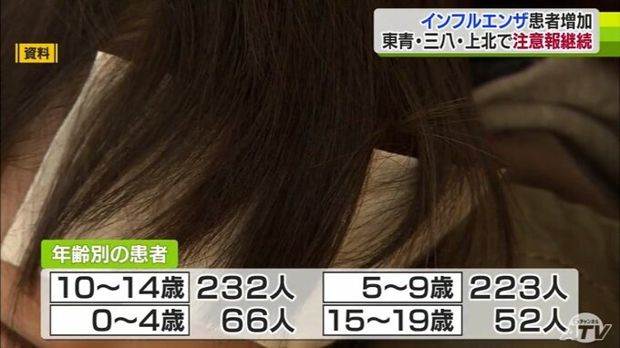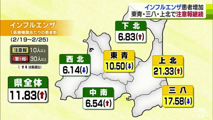 青森県内でインフルエンザの感染が拡大し東青・三八・上北の3つの地域で注意報が継続しています。