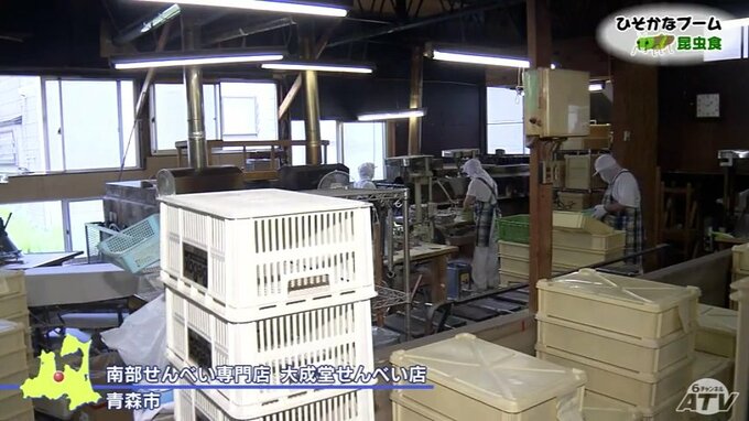 青森らしい昆虫食にするために、南部せんべいの専門店に製造を依頼。青森市の大成堂せんべい店がバッタの粉末を4%配合した生地を石窯で焼き上げて作っています。完成すると、見た目からは昆虫食とは分からない仕上がりです。