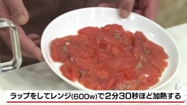 1.サクラマスの切り身を薄切りにして皿に並べ、軽く塩を振る。ふんわりとラップをしてレンジ(600w)で2分30秒ほど加熱する。