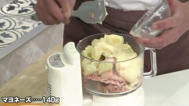 3.フードプロセッサーに1のサクラマスと2のじゃがいも、マヨネーズを入れ撹拌する。