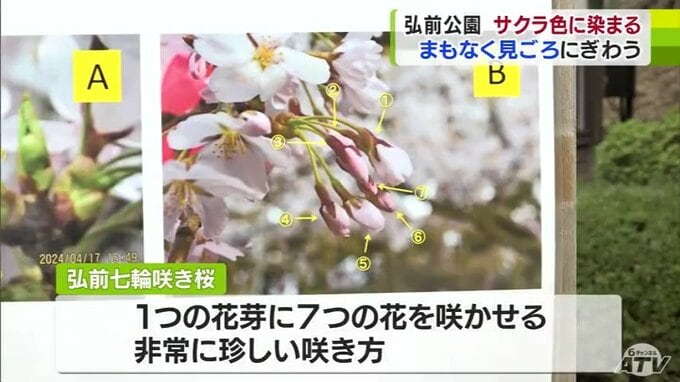 また、園内では最も長寿・樹齢100年を超えるソメイヨシノで、1つの花芽に7つの花を咲かせているサクラが確認されました。通常は4つ前後の花をつけますが、非常に珍しい咲き方で「弘前七輪咲き桜」と呼ばれています。