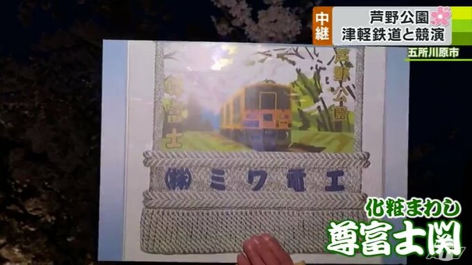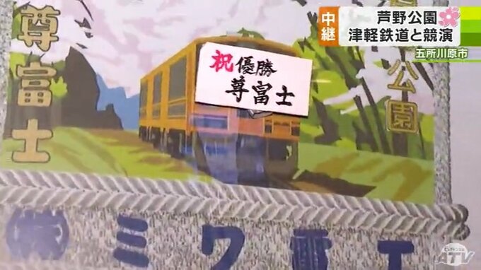 さて、ここ「芦野公園」の一番の見どころといえば『サクラ』と『津軽鉄道の列車』の競演です。今年は列車は別の形で話題になりました。それは…。大相撲春場所で新入幕優勝を果たした『尊富士関の化粧まわし』のデザインに採用されたから!
