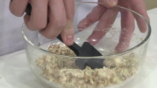 3.水切りした木綿豆腐をボウルに入れ崩しながら、白すりごま・塩・砂糖・しょうゆを入れて混ぜる。