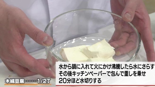 2.木綿豆腐は水から鍋に入れて火にかけ、沸騰したら水にさらす。その後キッチンペーパーで包んで重しを乗せ20分ほど水切りする。