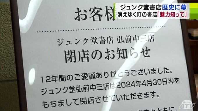 ATVの注目記事まとめ! 消えゆく町の書店 10年で50店舗以上が消滅 4割の自治体に“書店がない”青森県 「30分かけて来た」「残念だけど受け入れるしか…」現状とその背景 2024年5月6日(月) 21:00 国内 青森県弘前市の中心部で営業を続けてきた「ジュンク堂書店」が、4月30日で12年の歴史に幕を閉じました。 書店をめぐる環境の変化により「街の書店」は、徐々に姿を消しつつあります。 取材しました。