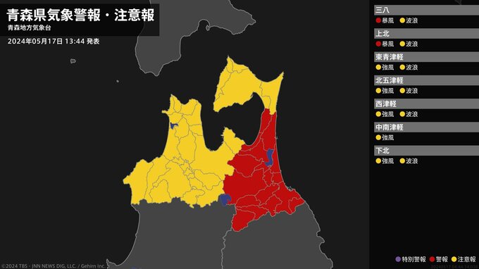 青森地方気象台は、17日午後1時44分に、青森県の三八上北地方に暴風警報を発表しました。