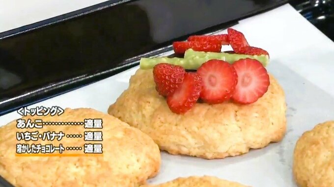 6.焼き上がったスコーンの上に、あんこ・いちご・バナナ・溶かしたチョコレートなどをタルトのようにトッピングして完成!