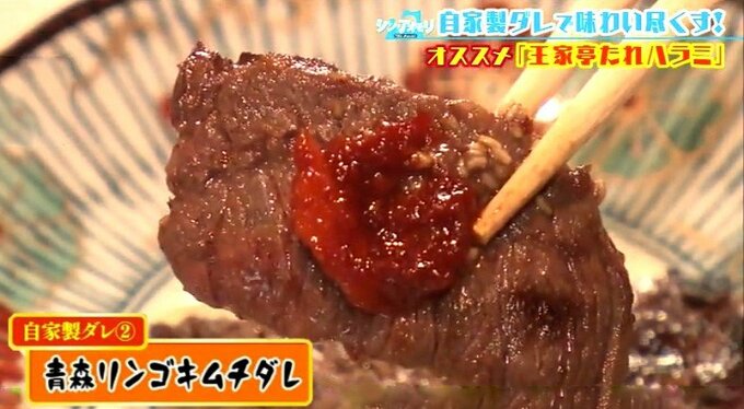 続いては「青森リンゴキムチダレ」をつけて。キムチ特有の辛さとリンゴのフレッシュさと甘さが肉の美味しさを引き立てます。辛いもの好きな人におすすめです。