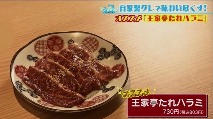 最初にいただいたのは「王家亭たれハラミ」(803円)。焼肉で人気の高い部位であるハラミを自慢の自家製タレで揉みこんだ一品です。外は香ばしく、中はジューシーな旨味が詰まった味わい。さらに、3種類の自家製タレを自由につけて楽しめます。
