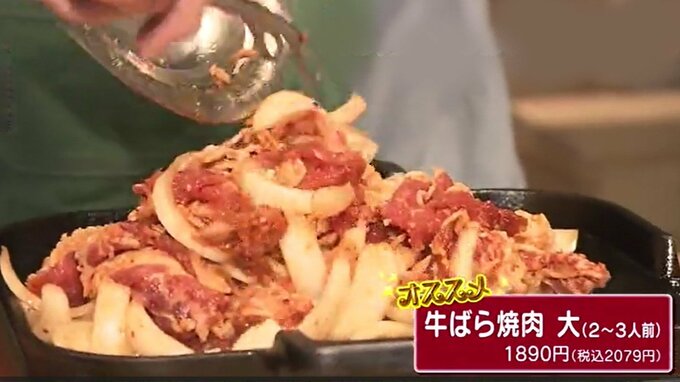 最後は、青森を代表するグルメの一つ「牛ばら焼肉 大(2~3人前)」(2,079円)をいただきます。こちらも自家製タレによる味付けで「味の王家亭」ならではの美味しさが楽しめる逸品。しかもスタッフがテーブルで調理してくれるサービスもあり、美味しく提供するこだわりが詰まっています。はたしてそのお味は?